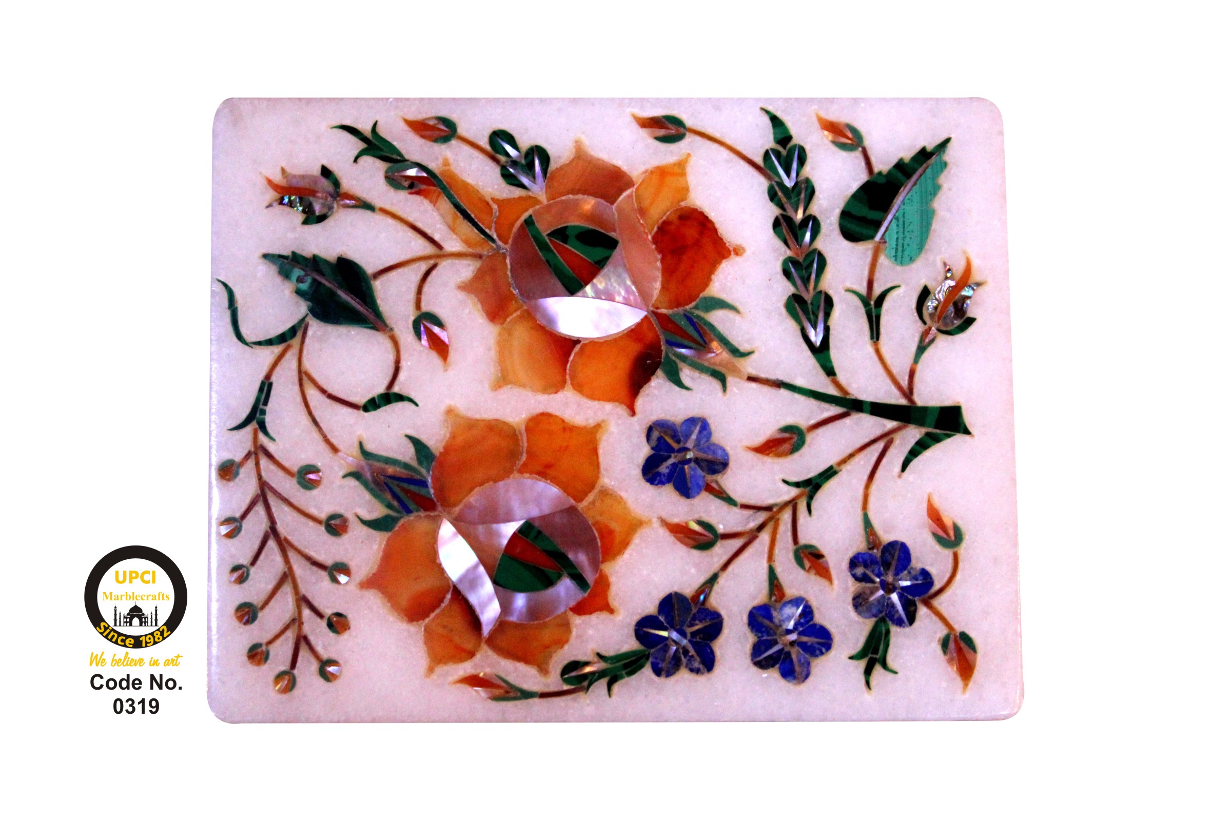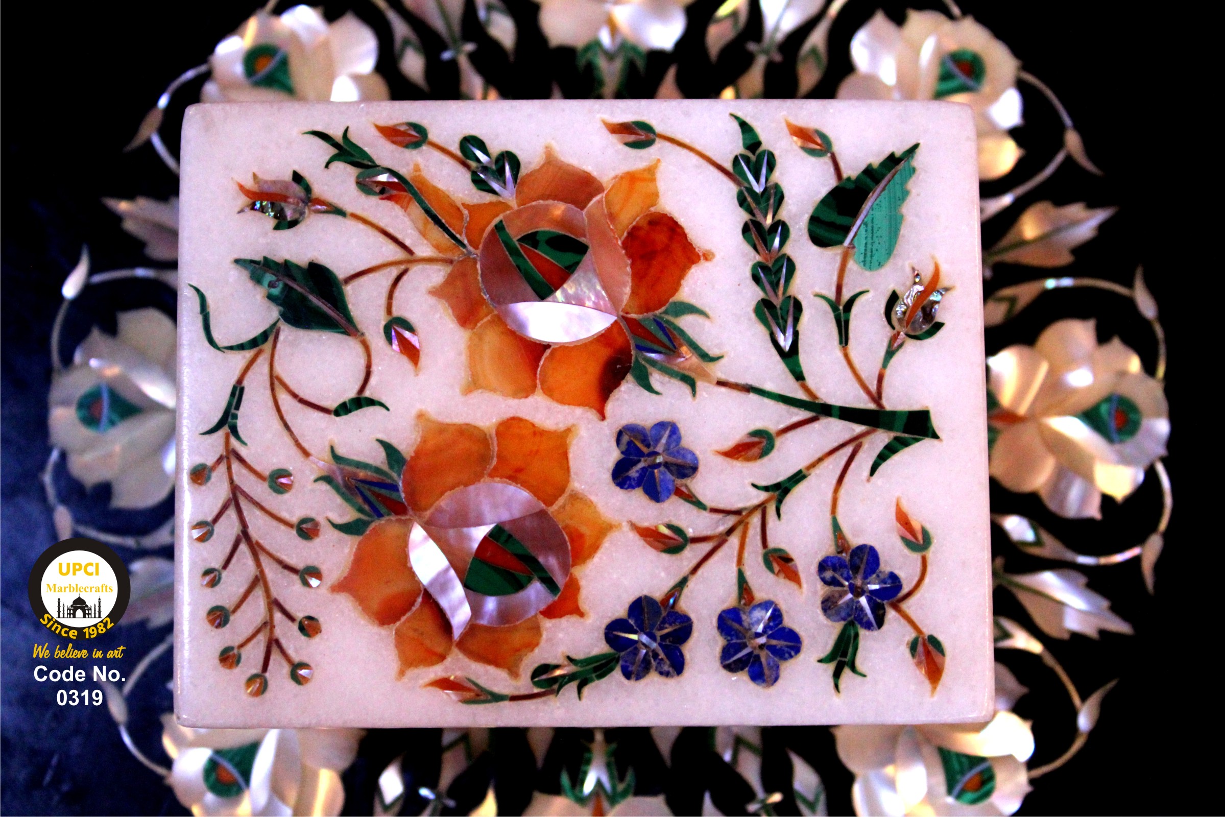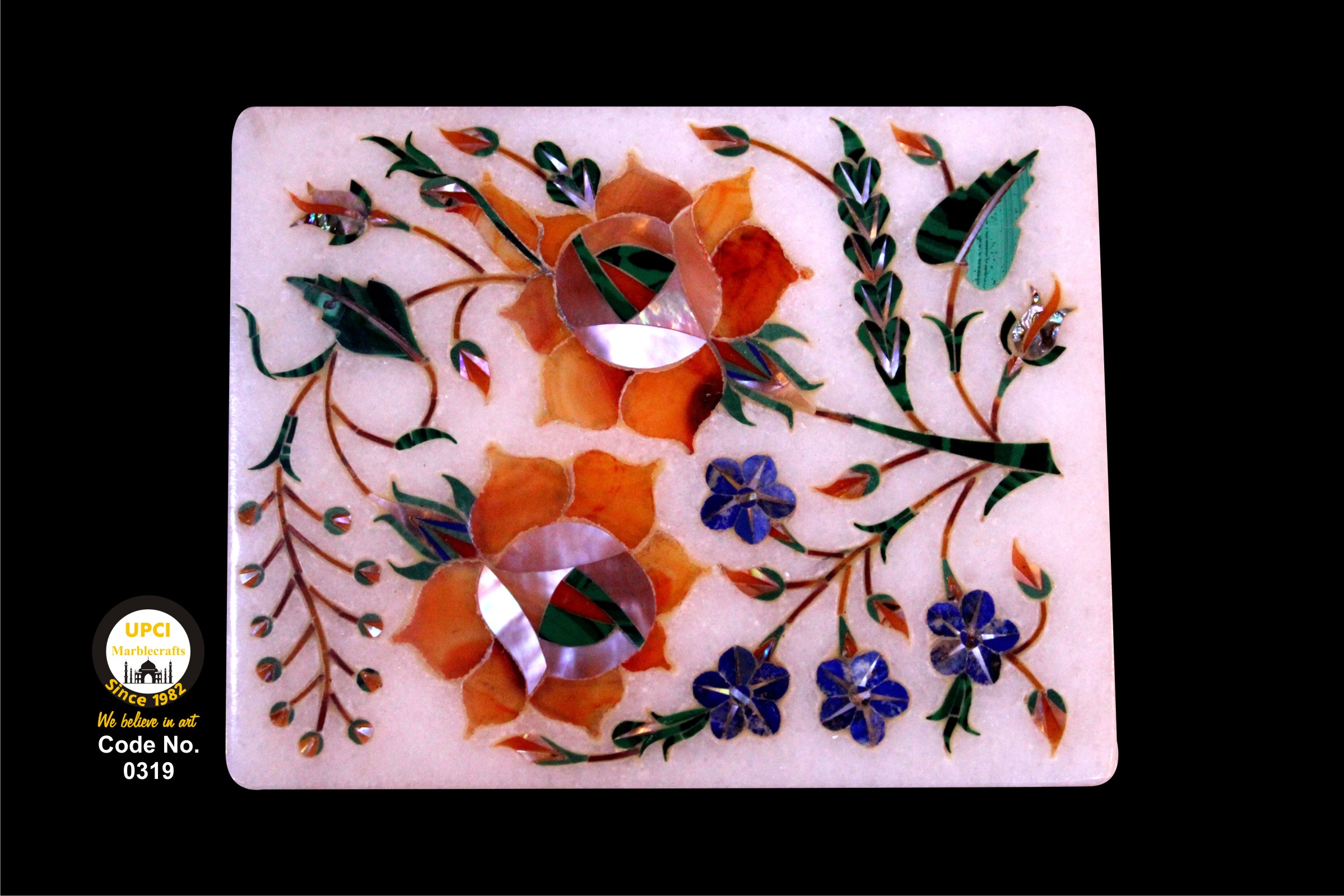 • We use semi-precious stone inlayed on marble like:- Lapis Lazualist, Cornalian, mother of pearl, Melachite, Jasper, Turquoise & Pava shell etc.